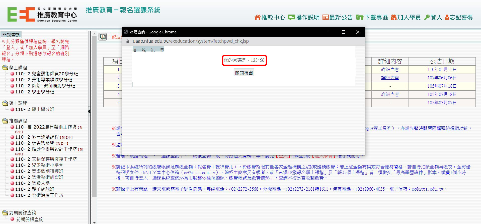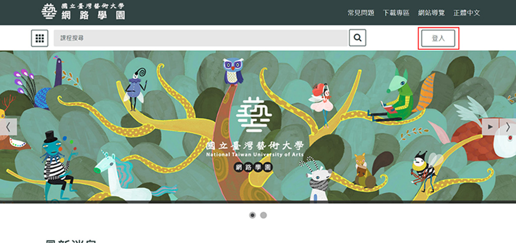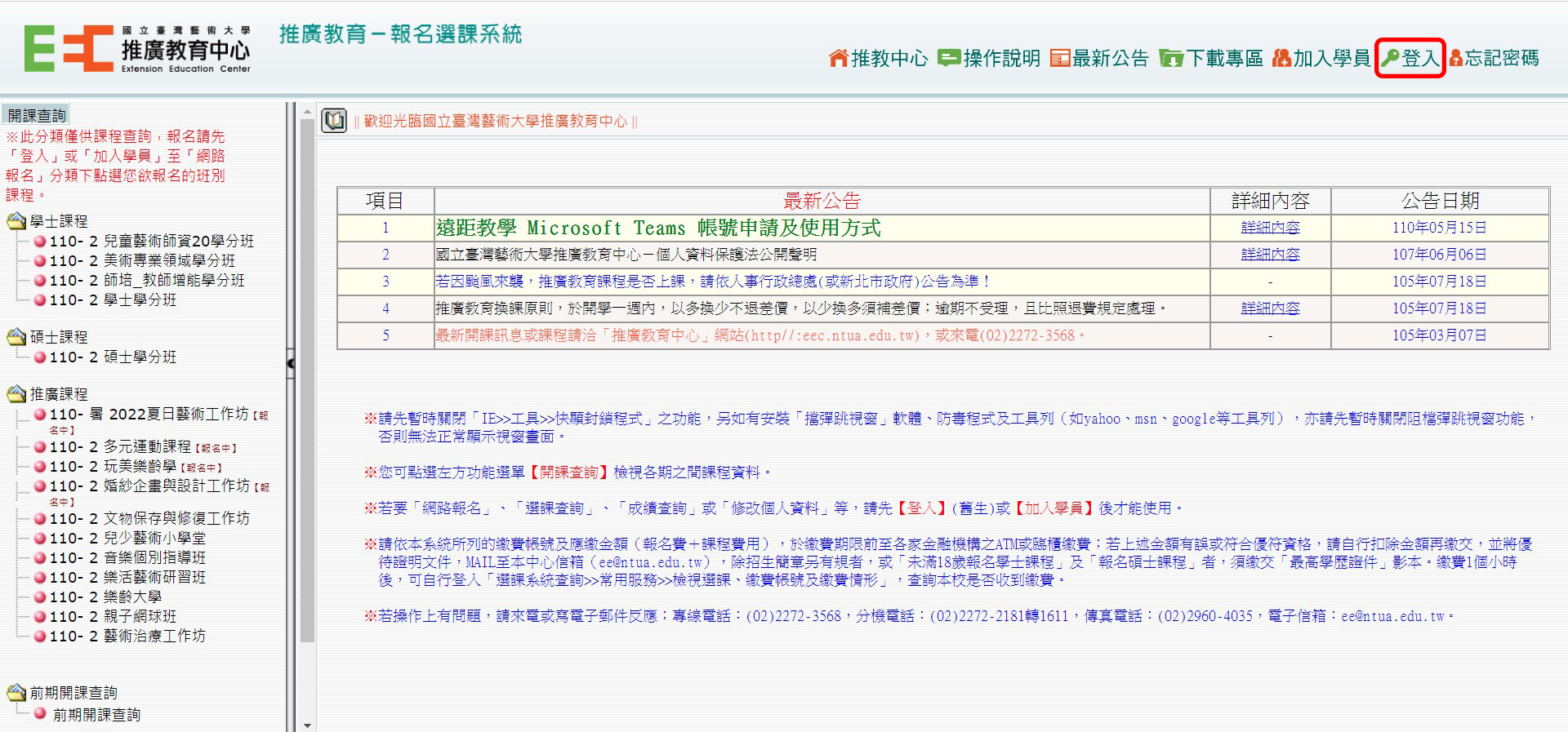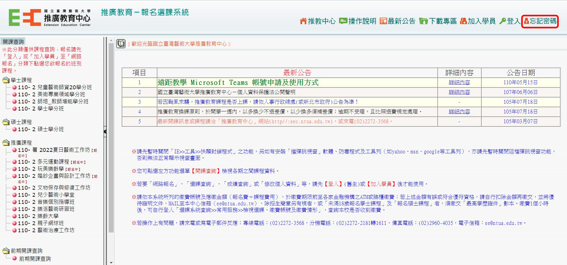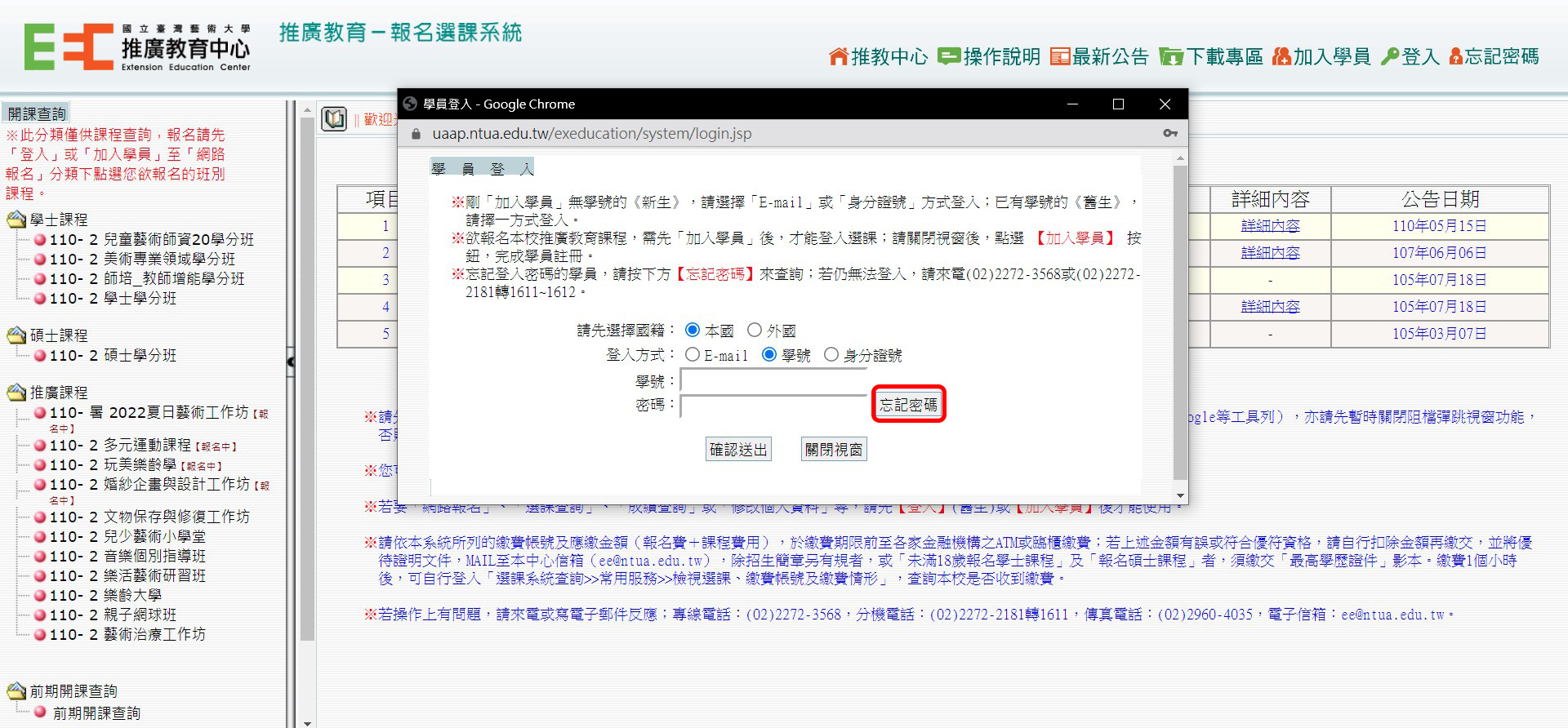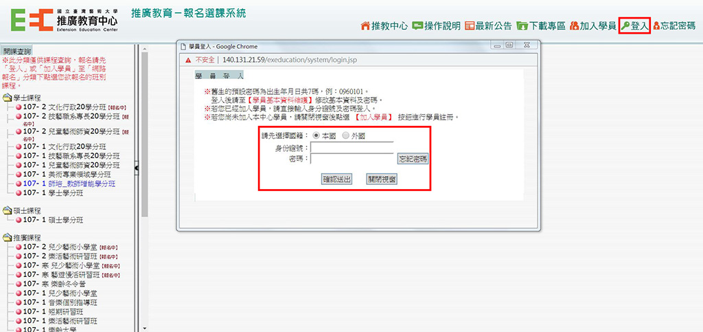 1. 請用瀏覽器開啟本校『 推廣教育報名選課系統 』,在右上角點選『登入』或『忘記密碼』。
