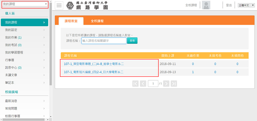- 登入網路學園後,在左上角『我的課程』或內容頁,會出現選修課程。