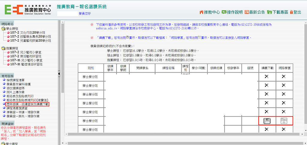 - 登入系統後請至『常用服務>>歷年修課記錄及講義下載』, 點選圖示可下載講義,點選圖示可以直接連入網路學園。