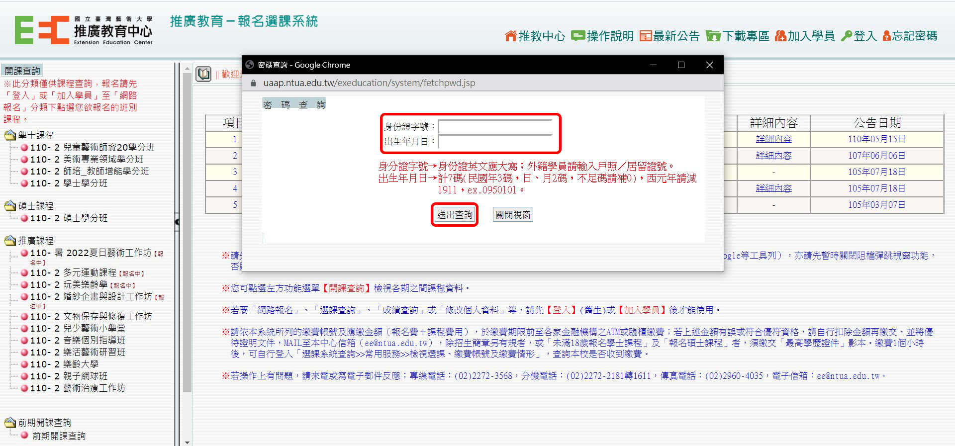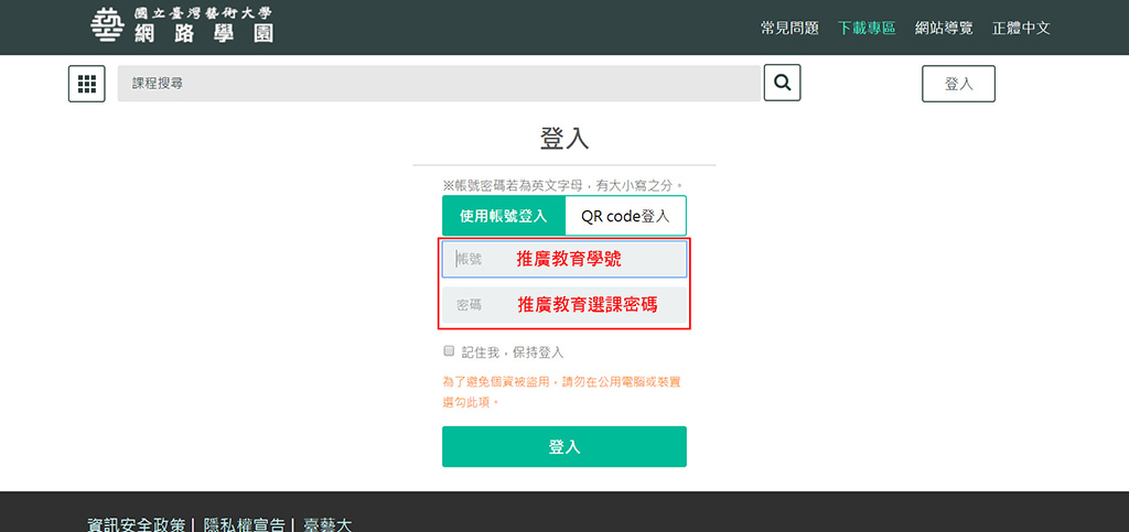 - 帳號為『身分證字號』,密碼為『推廣教育選課密碼』。